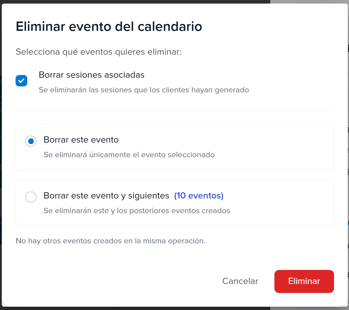 Era algo importante y pendiente de hacer... poder borrar todos los eventos creados de un "plumazo" por si nos habíamos equivocado o si simplemente queremos modificarlos... ya es posible, además, podrás borrar las sesiones asociadas a tus clientes marcando la casilla 👇