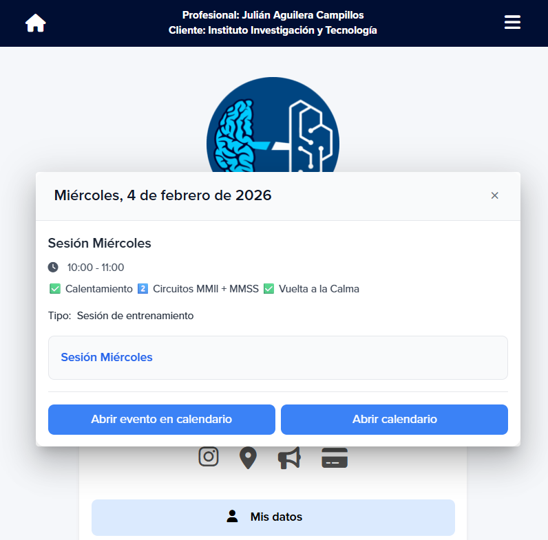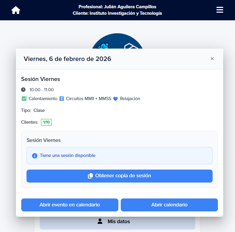 💡 Antes de enseñártelo, algo importante que debes saber es que el calendario está vinculado a todas las secciones de un cliente, es decir, las sesiones de correctivos, entrenamiento o protocolos que tengas previamente cargadas en ese momento para poder elegirlas y asignarlas a uno o varios clientes con solo un clic.