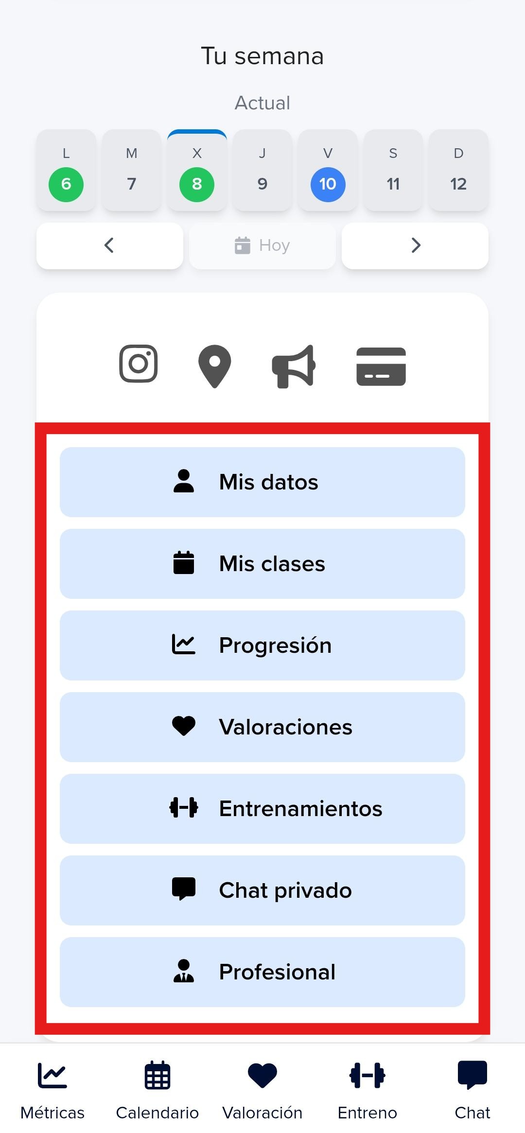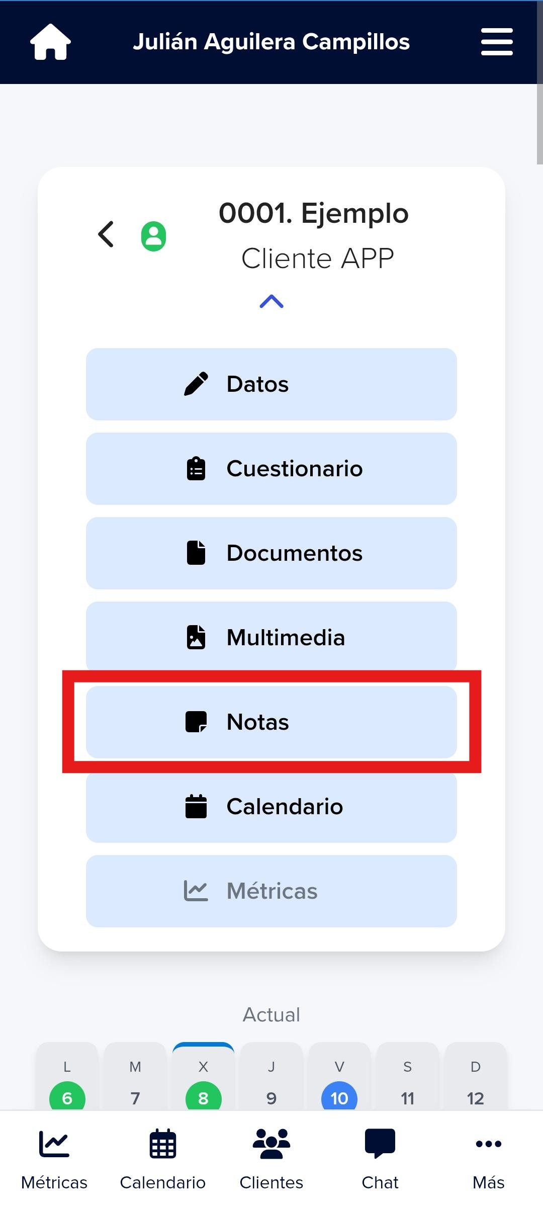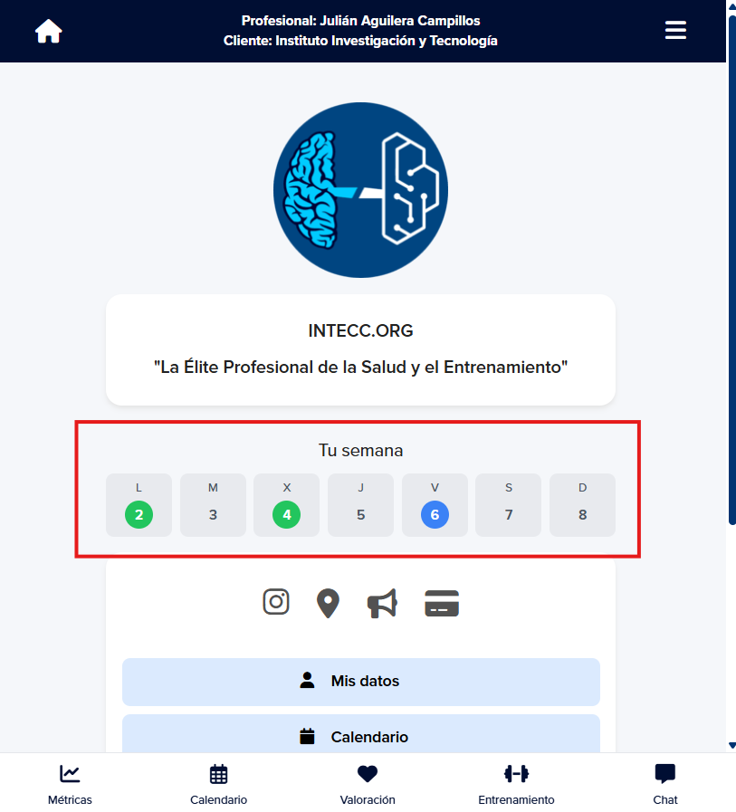 Una vez que el cliente se vincula con el profesional le aparecerá la siguiente portada y secciones (te enseñamos cómo hacerlo dentro de la Membresía):