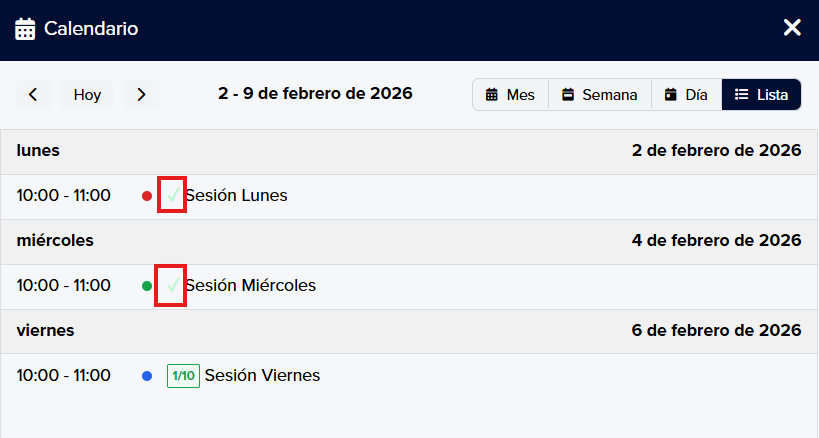 Cada tipo de sesión tiene un color diferente para que sea fácil de reconocer.