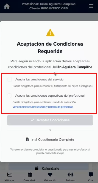 💡 Cuando un cliente entra por primera vez en la App y no está vinculado, podrá rellenar el cuestionario inicial, incluso aceptar las condiciones del servicio. Esto es importante ya que lo único que le tenemos que decirles es que se registren, rellenen y acepten las condiciones (marquen la casilla) de esta forma tenemos la información necesaria de ellos antes de empezar con nuestros servicios y han aceptado la normativa legal.